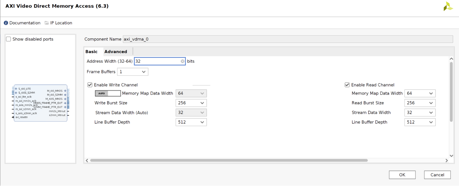5. Configure VDMA : Double-click the VDMA core to configure it. Set the parameters according to your video resolution and memory interface requirements. This includes specifying the number of frame buffers and setting the base addresses for the frame buffers. The VDMA configuration is shown in Figure 3.