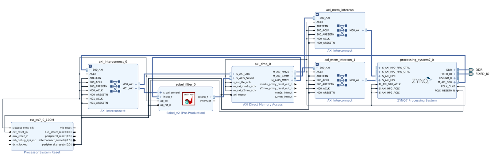 - AXI Interconnect – connects the AXI DMA, ZYNQ7 Processing System, and Sobel filter IP core for memory-mapped communication.
