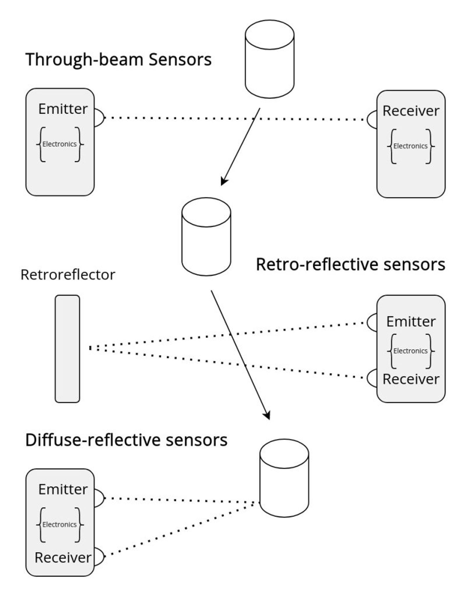 For the last of the photoelectric sensors there are diffuse sensors. For diffuse sensors light is scattered and returned to the receiver by the object being detected rather than by a reflector. Their main advantage is simplicity and flexibility because they don’t require any external reflector or receiver component. They can also be mounted vertically if needed and their detection range can often be adjusted which allows an additional degree of freedom. However their range is significantly lower than the previously mentioned sensors and they are more sensitive to ambient light and object surface. Same as for retro-reflective sensors some of the issues can be reduced by methods such as background suppression,polarization filters and multi-frequency light emission.