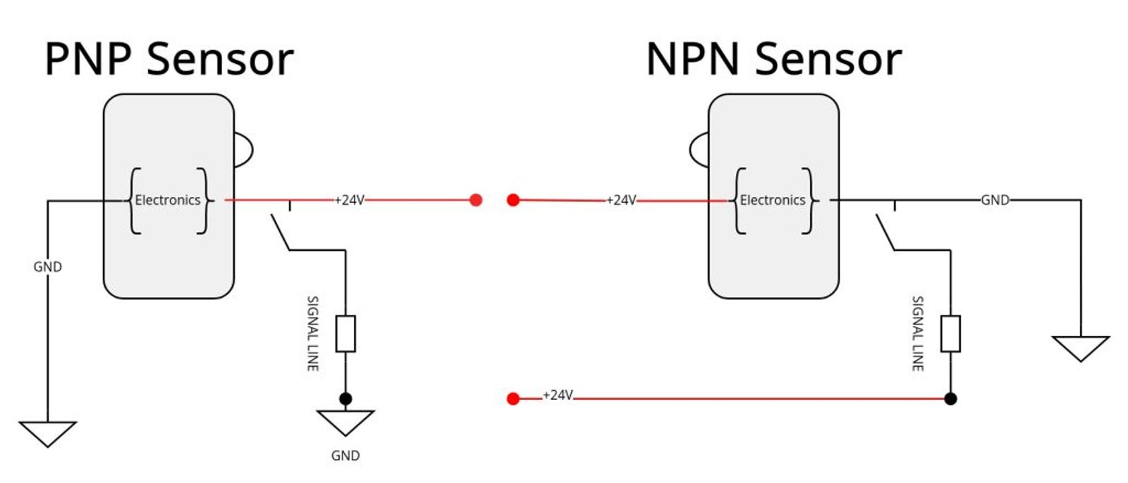 Often while searching for sensors apart from the type of sensor you will see terms PNP and NPN in sensors product page. These terms refer to the type of switching transistor used in the output of the sensor. The choice between PNP (Positive-Negative-Positive) and NPN (Negative-Positive-Negative) is determined by the nature of the system where the sensor is installed. See Figure 1 for a wiring example.