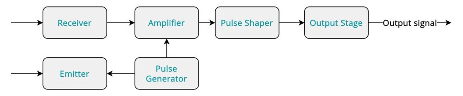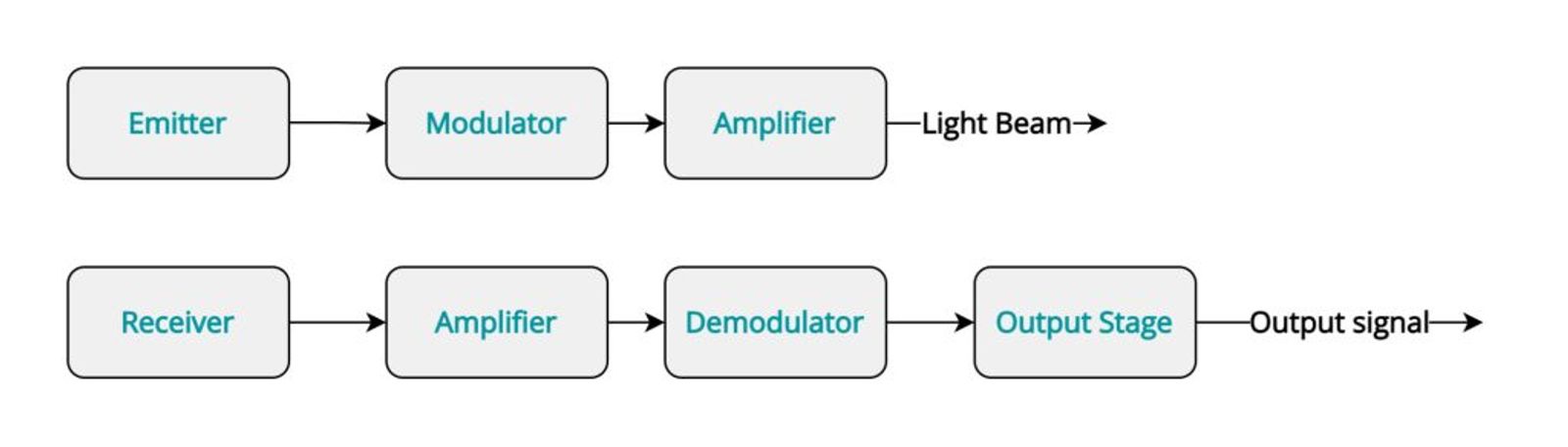 Through-beam Sensors come in two parts, there is a transmitter and there is a receiver which is placed opposite to the transmitter. Transmitter projects a laser into the receiver and when the laser is interrupted we get a signal. Main advantage of using Through-beam sensors is their long operating distance no matter the object type. Drawback is the increased price because you need 2 different packages and you have 1 additional wire coming to your controller/plc. See Figure 3 for block diagram.