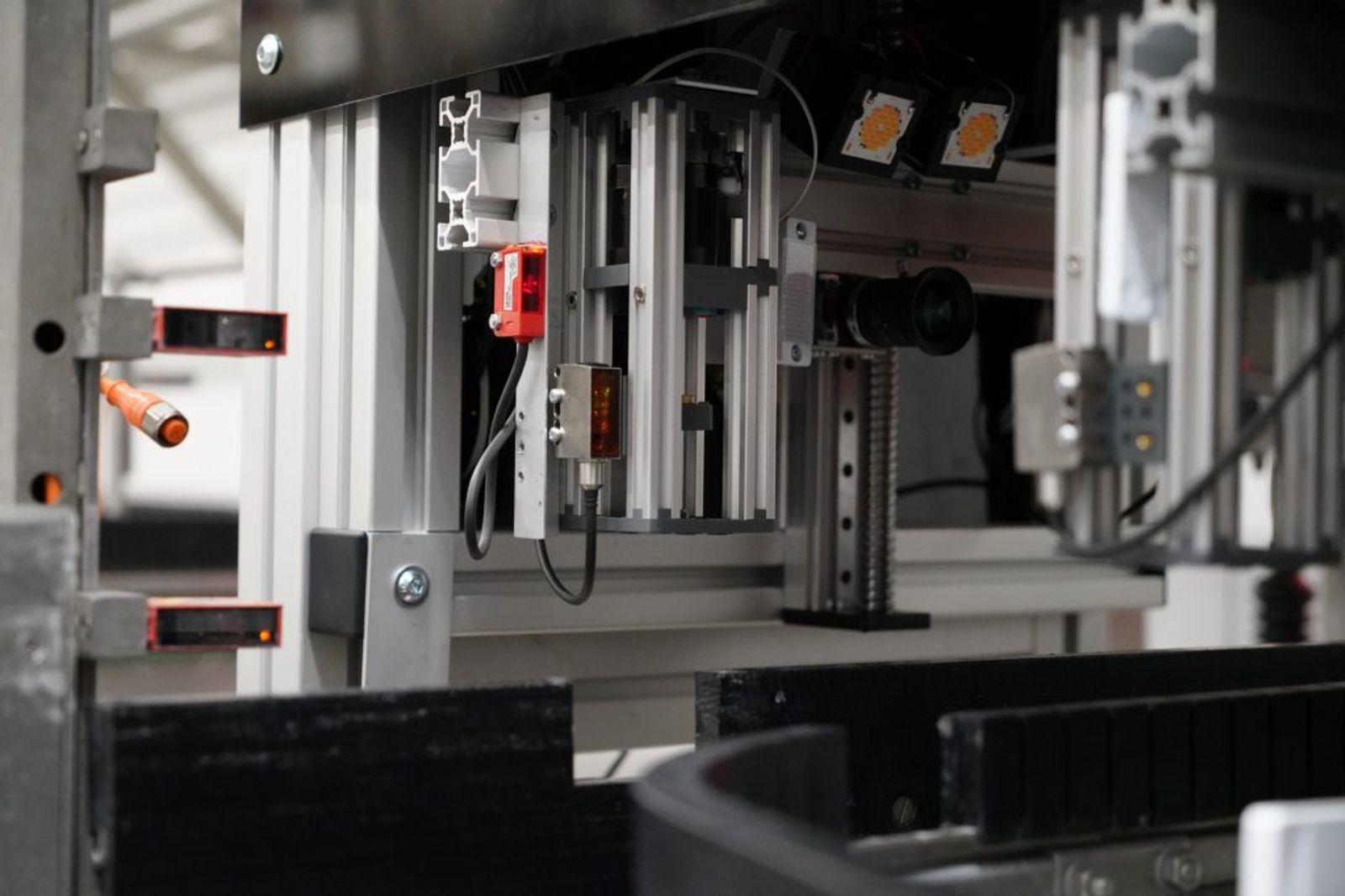 In Figure 5 we see a setup containing multiple sensors of multiple types. Specifically we see Leuze branded retro-reflective sensor which in this case is used for bottle cap detection, Leuze branded through-beam sensors for liquid level detection + 2 more retro reflective sensors on the left side at various heights of the bottle. Using an array of multiple sensors allows us flexibility while tracking the bottle and significantly reduces error rates.