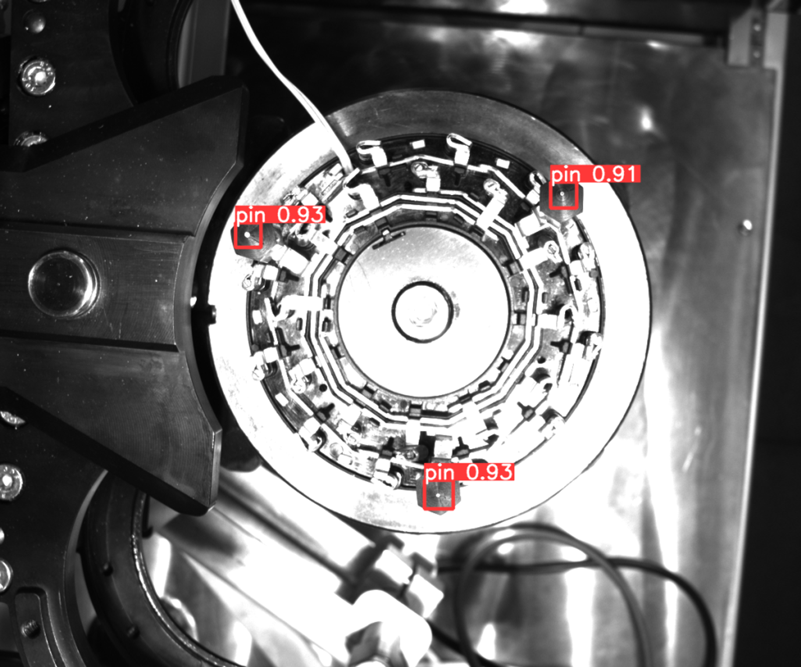 Traditional rule-based solution could be used, but since lighting variations can happen because of pin displacement, reflections and/or partial occlusion, this can result in false positives and false negatives. Therefore, we opted for a more robust solution based on machine learning, in object detection framework. Pins can be detected based not just on their bright top, but based on local features of the entire pin. Since we are interested in the precise position of the top, it should be selected as the center of the ‘’object’’ bounding box. Also, we separate detections for 3 locations because of the specific view angle, which improves detection reliability. It is important that, in this case, relevant image regions could be cropped, which decreases processing time considerably and removes the need for a specialized accelerator (GPU). Namely, input image size can generally increase processing time significantly.